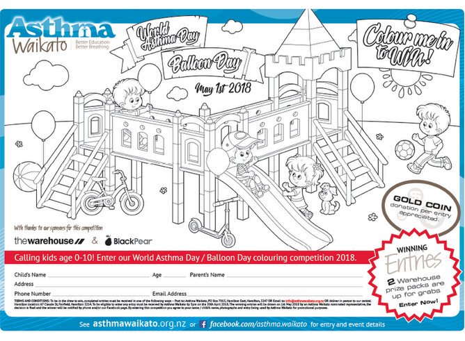 World Asthma Day / Balloon Day is a day to pause and think about your breathing and spare a thought for those who have no choice but to think about it constantly. We are running a colouring competition for 0-10 year olds to enter. BlackPear have sponsored the competition design work and The Warehouse Hamilton Central have sponsored 2 prize packs. To enter, download the colouring competition page from below, print it off and start colouring! Or pop in to our office 67 Claude Street, Hamilton and pick one up from us.